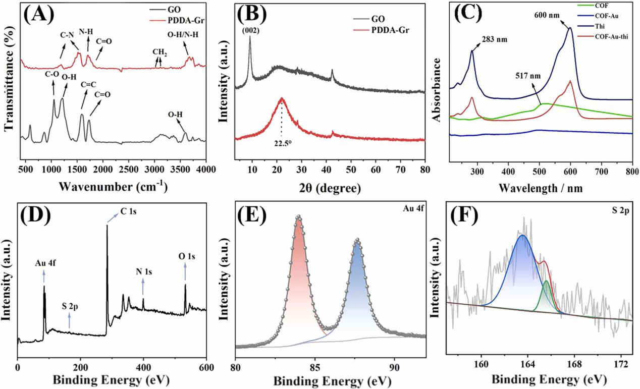 图 2.(A)GO 和 PDDA-Gr 的 FTIR 光谱;(B)GO 和 PDDA-Gr 的 XRD 图谱;(C)COF、COF-Au、Thi 和 COF@Au-Thi 的 UV-vis 光谱;(D)COF@Au-Thi 的 XPS 全谱;(E)Au 4f 的 XPS 光谱;(F)S 2p 的 XPS 光谱。