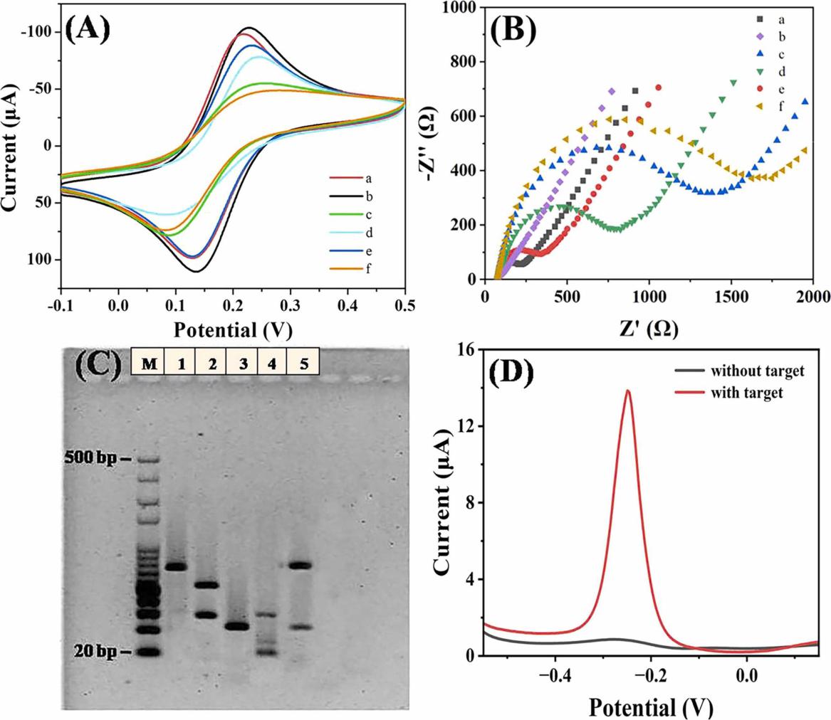 图 3.(A)CV 和(B)EIS 在含 0.1 M KCl 的 5 mM [Fe (CN)6]3-/4-中对传感器的表征;(C)琼脂糖凝胶电泳测量(M:DNA 标记物,20~500 bp);(D)传感器在 PBS 溶液(pH=7)中有无目标时的 DPV 信号响应(目标浓度为 107CFU/mL)。