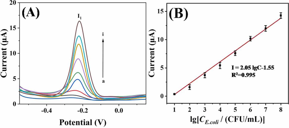 图4. (A) 不同浓度大肠杆菌的差分脉冲伏安(DPV)曲线(从 a→i:0→108CFU/mL)。(B) 电流与大肠杆菌浓度对数之间的线性关系。